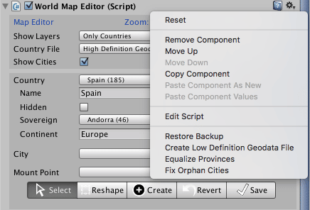 Restore Backup: the first time you save changes to disk, a backup of the original geodata files will be performed. The backed up files are located in Backup folder inside the main asset folder. You may manually replace the contents of the Resources/Geodata folder by the Backup contents manually as well. This option do that for you.