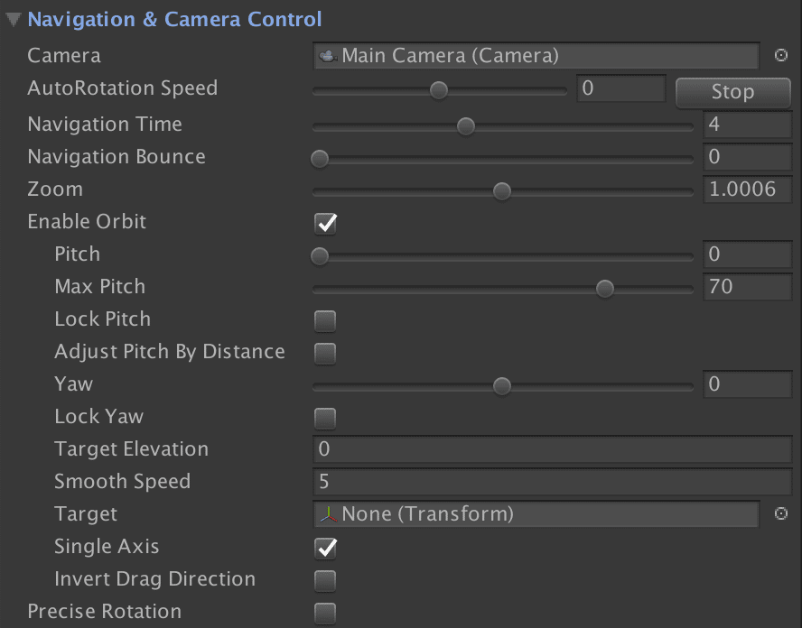 When “Enable Orbit” is enabled, you can control camera pitch/yaw as well as use the OrbitTo() and other orbit APIs.