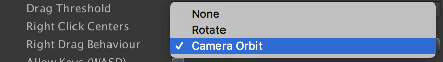 Also, you can set the right drag behavior to “Orbit” under the Interaction section: