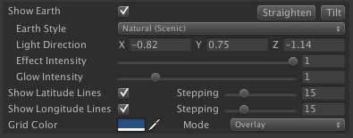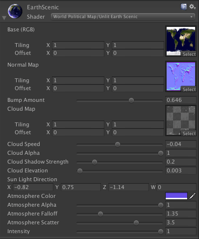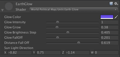 Above image: properties of the Earth Glow shader shown in the inspector.
