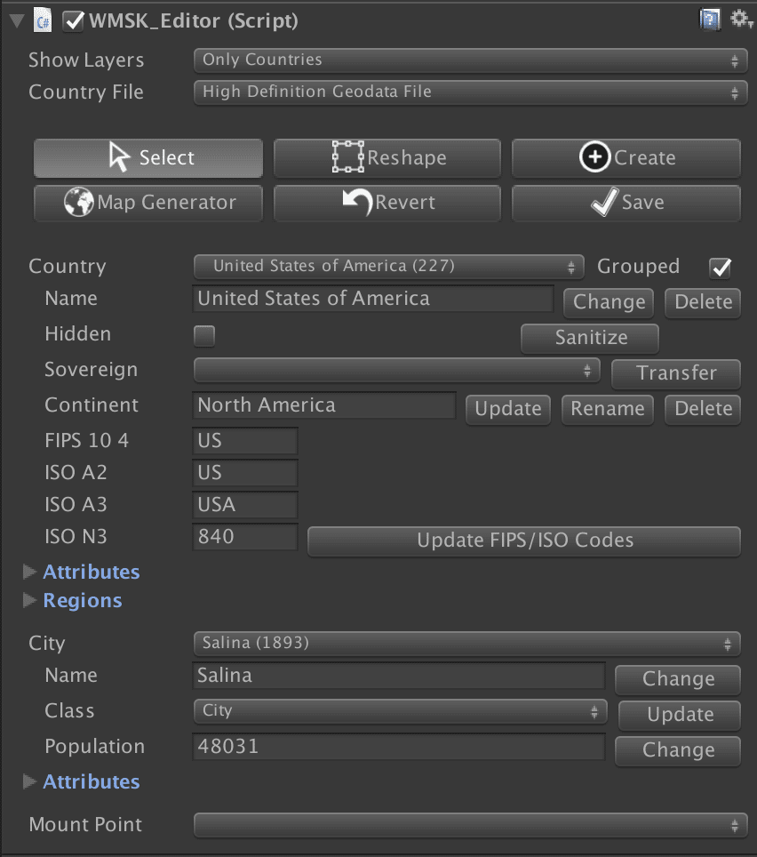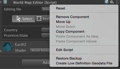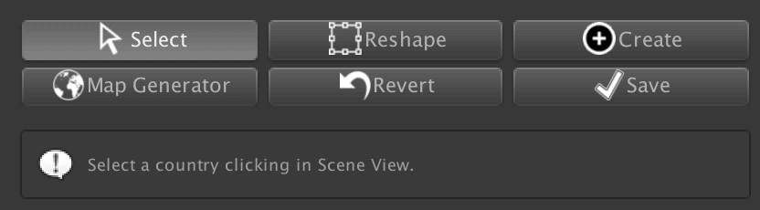 - Select: allows you to select any country, province or city in the Scene view. Just click over the map in Scene View. You can select multiple provinces holding Control key.