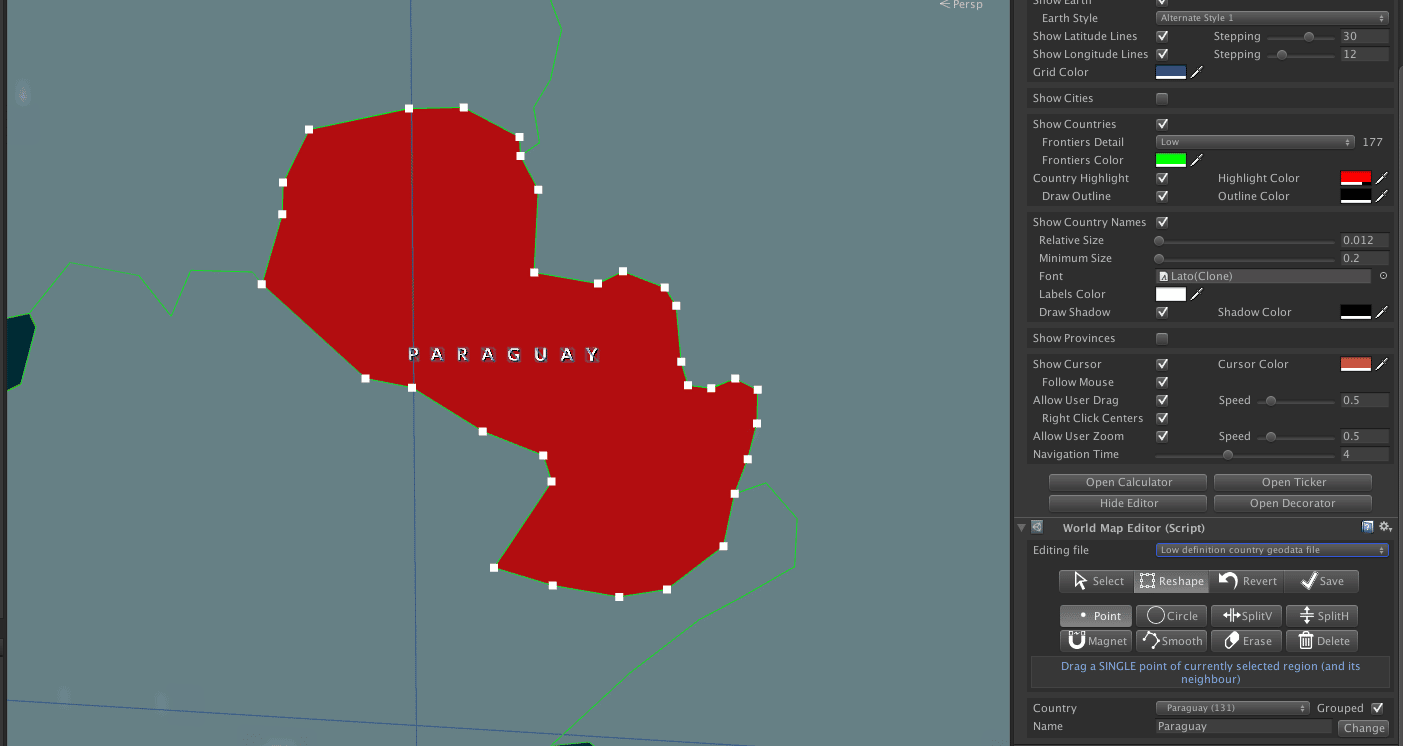 You can also create new regions by splitting existing countries and provinces in two drawing a separation line between two border points. To perform the split start drawing a line near a border and continue cliking adding points and extending the line towards the opposite border (notice keyboard shortcuts printed in the Scene View window).