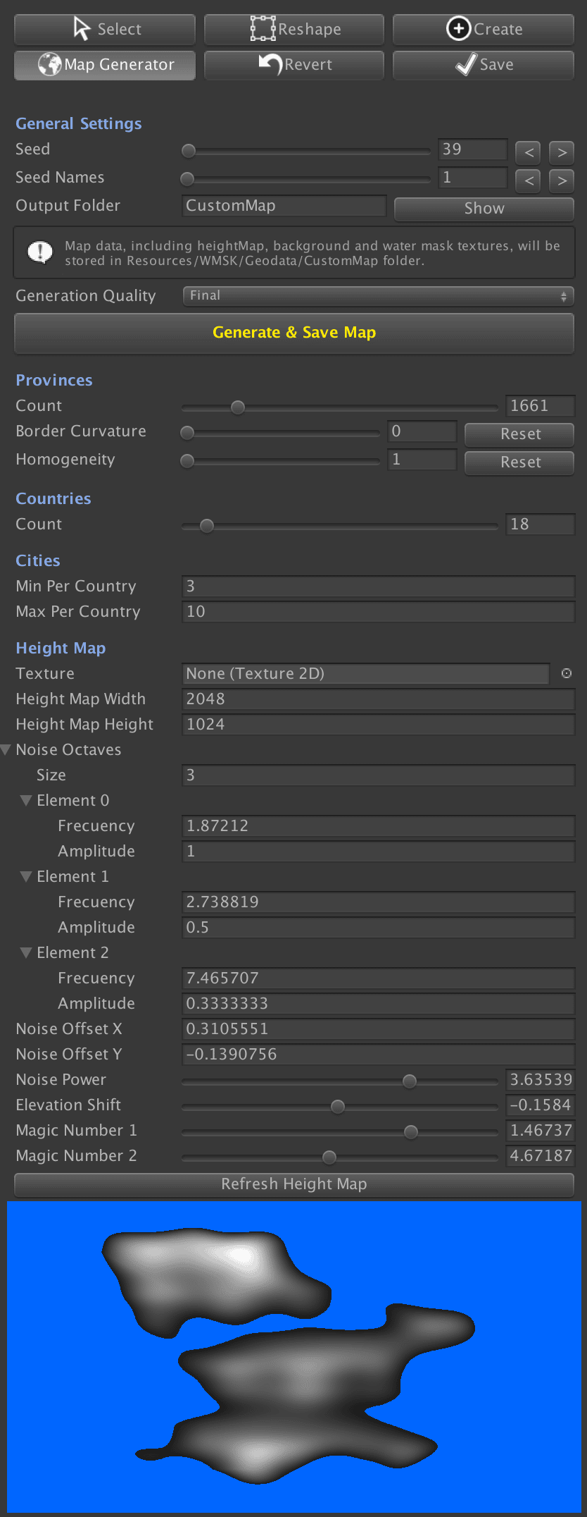 Press “Generate & Save Map” to create the world map files and update the representation. Choose “Draft” as generation quality while testing parameters as this option increases the speed of map generation.