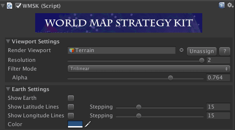 If you want to show the terrain splatmap textures instead of the Earth background texture, un-select “Show Earth” and increase the Alpha value. Once you do this, the country frontiers will be blended with the splatmap textures!