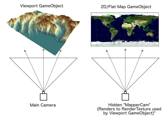 The 2D/Flat map is positioned out of the Main Camera frustum so it’s not visible. A hidden camera created by WMSK named “MapperCam” captures the image from the normal map and renders it to a RenderTexture which is used by the Viewport gameobject’s material.